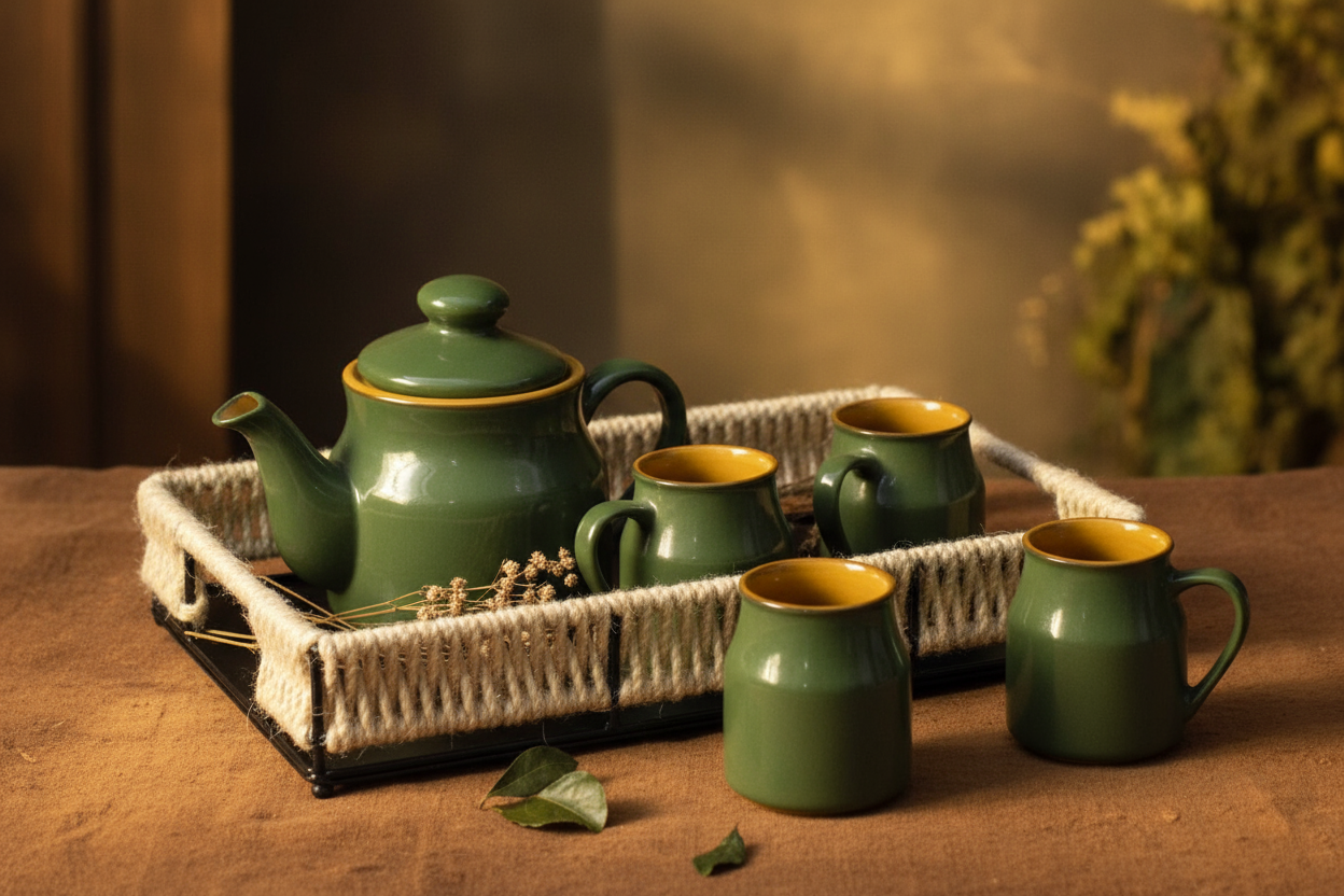 Elevate your tea-time experience with The Clayza’s handcrafted ceramic tea set. Designed in a soothing olive-green glaze with a warm golden-brown rim, this set exudes rustic elegance and modern charm. Perfect for daily use or special gatherings, it comes with a teapot, four matching cups, and a sturdy rope-wrapped tray—making it both functional and stylish. A beautiful blend of tradition and contemporary design, this tea set adds a touch of sophistication to your serveware collection.