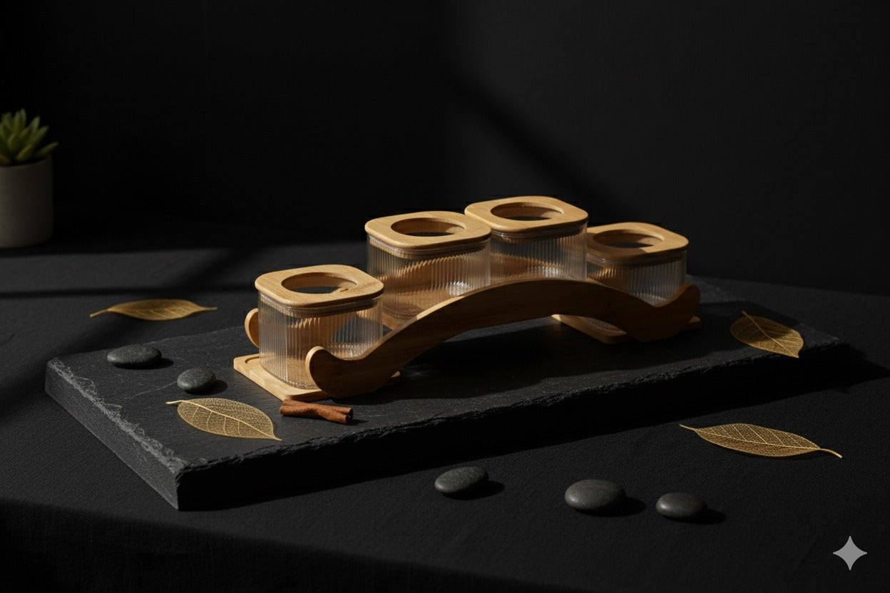 Discover the perfect blend of sleek organization and natural materials with the Bamboo Bliss Jar Set. This exclusive condiment set features four ribbed glass jars with smooth, square bamboo lids and a beautifully curved wooden serving tray. Its sophisticated design provides a striking presentation for spices, sugar, tea, or small condiments, instantly transforming countertop storage into a minimalist, organized statement.